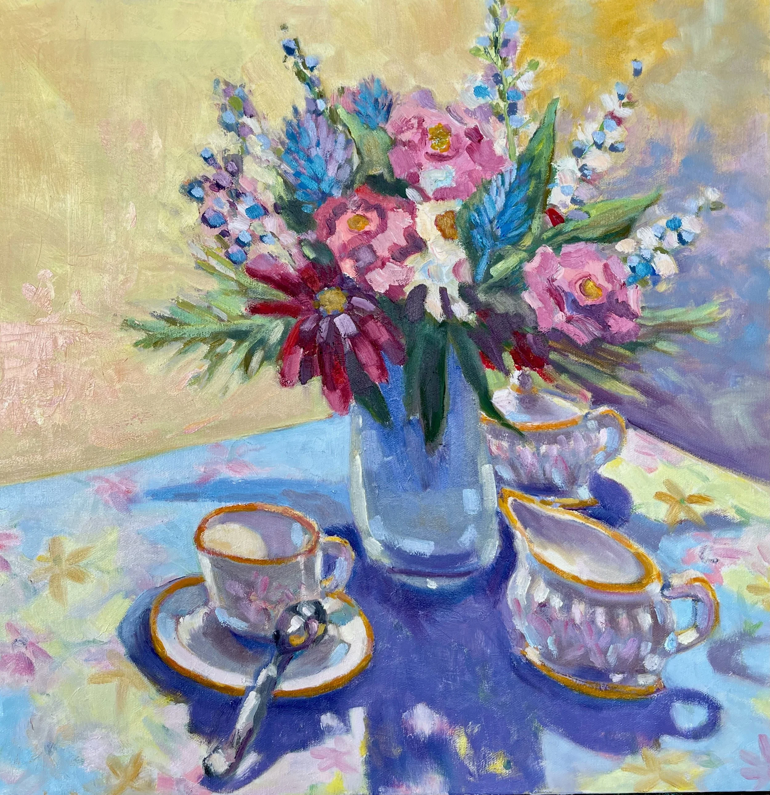 Daffodils on my mother’s table cloth, with my grandmother’s teacup. Oil on gallery wrap canvas, 8x10.